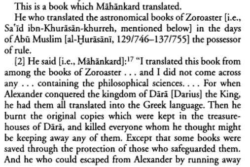 This passage is from an Arabic translation of a Middle Persian study of astronomy attributed to Zoroaster. This first text sets up the idea that the ‘Abbasids continued a translation program already familiar to the Sasanians. Check out the description of Anushirwan for comparison.