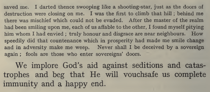 Sharaf al-Dawla embarked in his barge after arches had been erected in his honor on the bank of the Tigris, and the houses on both banks had been decorated elaborately. The caliph held a public reception, at which he bestowed upon him Sultanic robes, with a crown, bracelets and a collar; with his own hand the caliph tied for him two banners, one black and one white; and his deed of appointment was read out in his presence. After leaving the caliph’s presence, he went to see his sister who was married to the caliph, and stayed with her till the afternoon, when he returned to his own palace; the people had been expecting him all the time. When the banner was lifted, it tore and a piece blew away. He regarded this as a bad omen, but the caliph told him that, as the wind had carried away a portion of it, what was presaged was that he should reign wherever the wind blew.