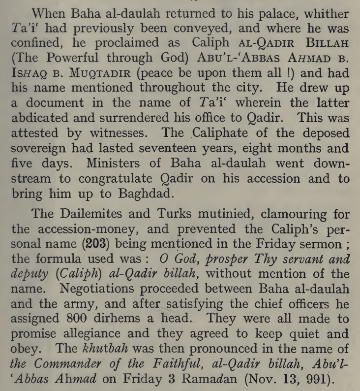 Account of the proceedings at the reception of [the Buyid emir] Sharaf al-Dawla by the caliph [al-Ta’i’, in 377]