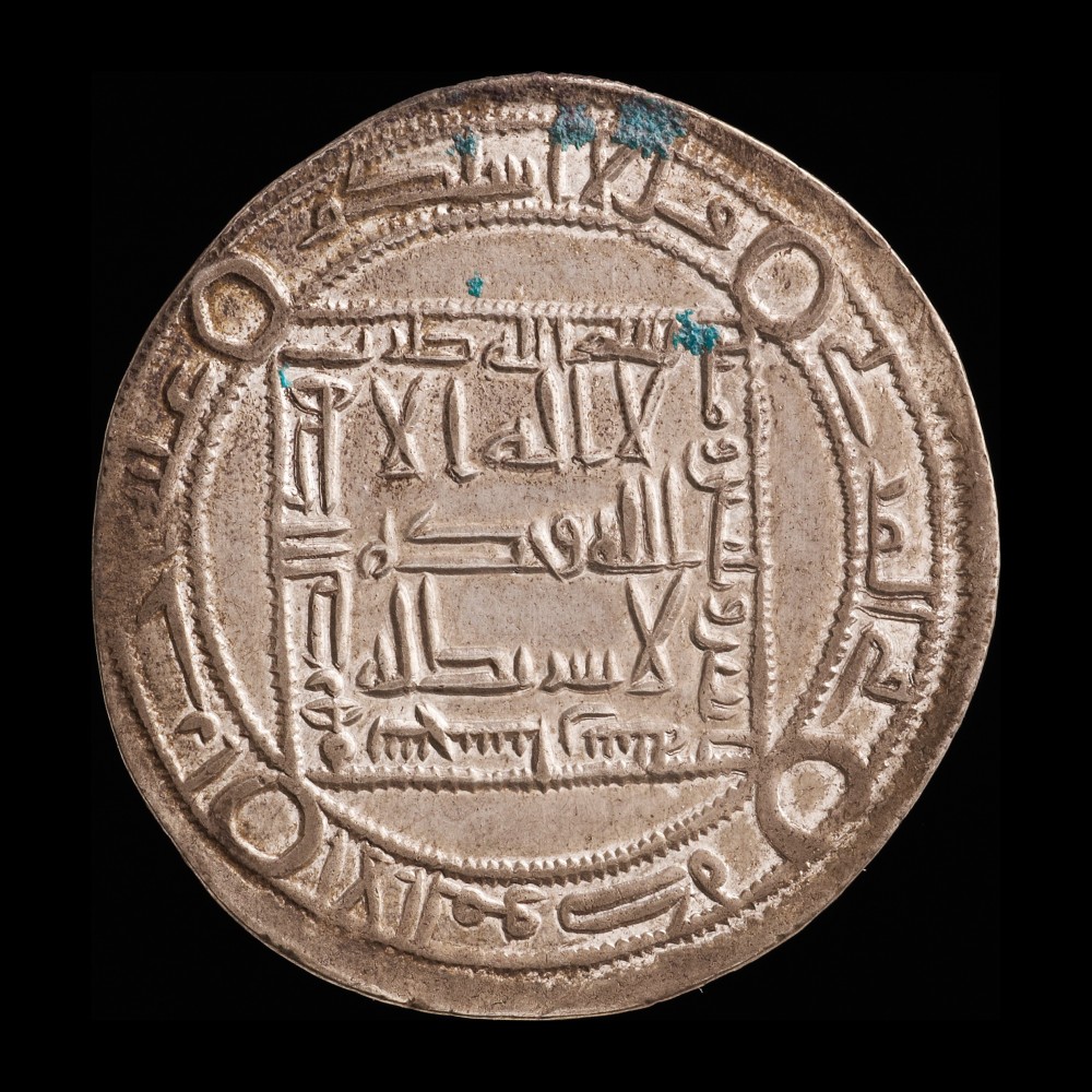 This inscription includes a Qur’anic verse that is not typically found on coins. It refers to “love of kin,” likely chosen to stress kinship to the Prophet Muhammad.