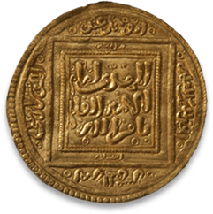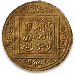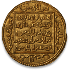 Right: Center: Prince of the Catholics, Alfonso son of Sancho, May God protect and assist him!; Margin: this dinar was struck in the City of Toledo the year three and twenty and two hundred and one thousand safar (era) [1185].