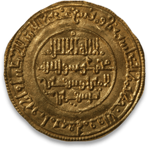 Right: A largely illegible imitation in both field and margin of a standard Almoravid (Murabitid) dinar.