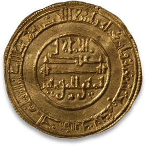 Right: Center: the Prince, Servant of God, Commander of the Faithful; Margin: in the name of God this dinar was struck in Aghmat the year three and ninety and four hundred.