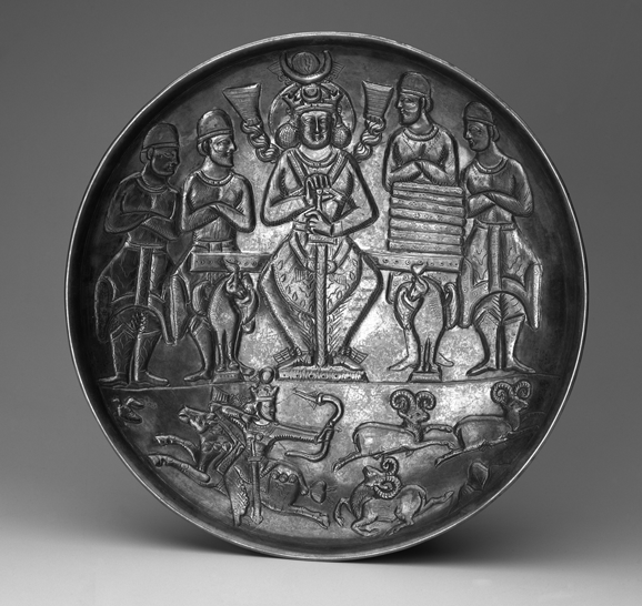 Bust of Khosrow I Anushirwan, wearing cap, crenelated crown with crescent and diadem tie below elevated globe, crescent at front, star left and right. Short beard, small ball of hair, mustache; diadem behind each shoulder, crescent on each shoulder. 1 ring, crescent symbols. Inscription in Middle Persian: “Increase, Khosrow”