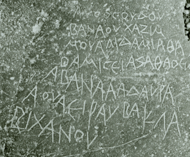 This inscription is in the Old Arabic language, but it uses the Greek script. This tells us that an Arabic-speaking person, likely a nomad, was familiar with Greek writing (though probably not the Greek language). It was found in northern Jordan and dates to the 3rd or 4th century.