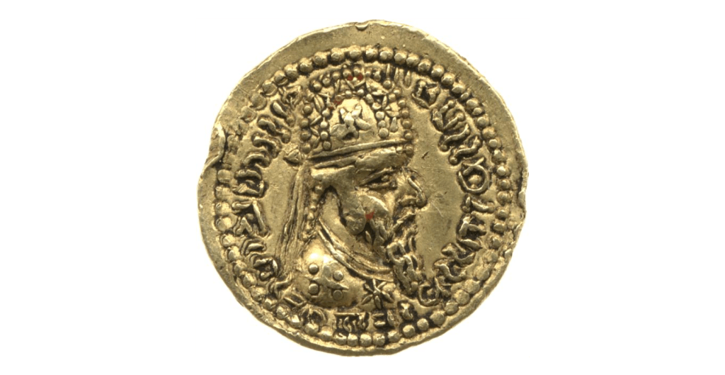 This coin shows the bust of Ardashir I, wearing tiara with ear flap and diadem; long beard, mustache. Inscription in Middle Persian (in Pahlavi script): “The Mazda-worshiping Lord Ardashir, King of Kings of the Iranians.”