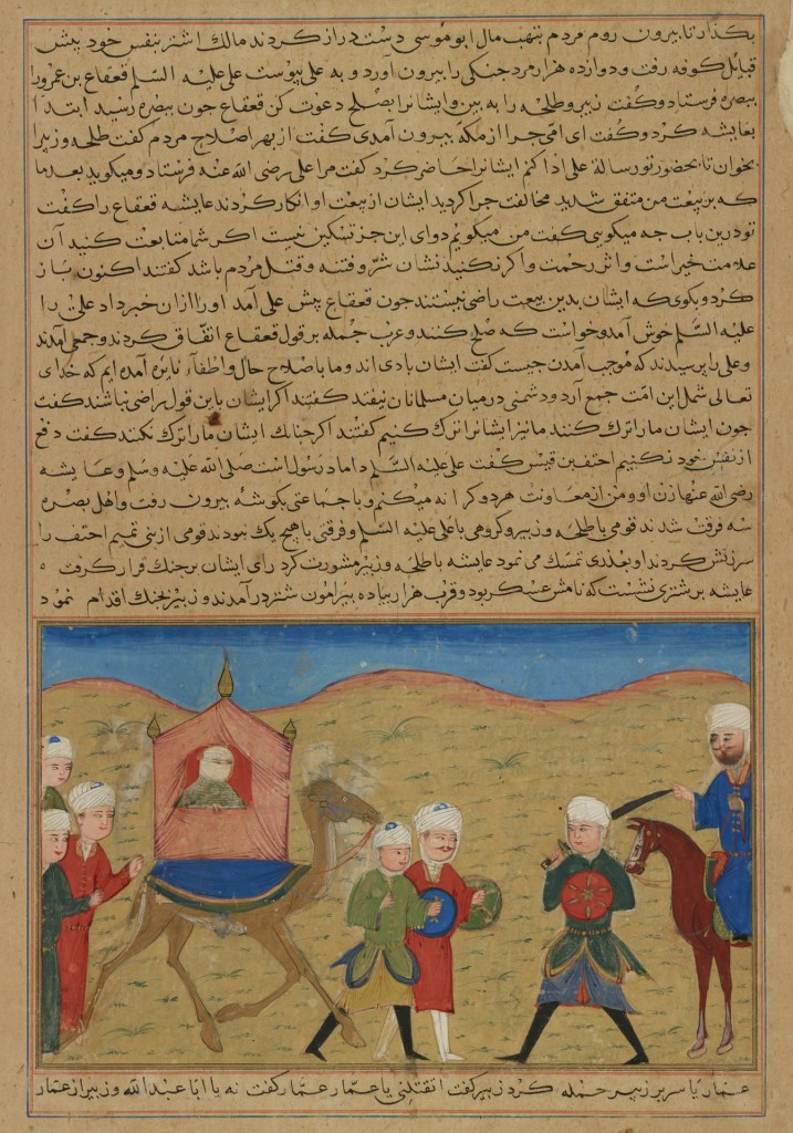 When he [‘Ali] learned of the journey of ‘A’isha and Talha and Zubayr from Mecca to Basra, he praised God and said: ”A’isha and Talha and Zubayr have begun their journey. Each of the two men claims the caliphate separately from the other. Talha claims the position of caliph because he is the paternal cousin of ‘A’isha and Zubayr because he is the son-in-law of her father [Abu Bakr]. By God, if they are victorious in what they want, then Zubayr will kill Talha or Talha will execute Zubayr, each in dispute over [the right] to the kingship. By God, I know that she is the one who rides the camel. She will not stop at any pasture, nor follow any steep path and she will not stop anywhere except in rebellion against God until her soul and [the souls of] those who are with her come to an end.”