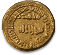 Right: “Muhammad is the messenger of God”; Margin: “this dinar was struck in al-Andalus the year eight and ninety”