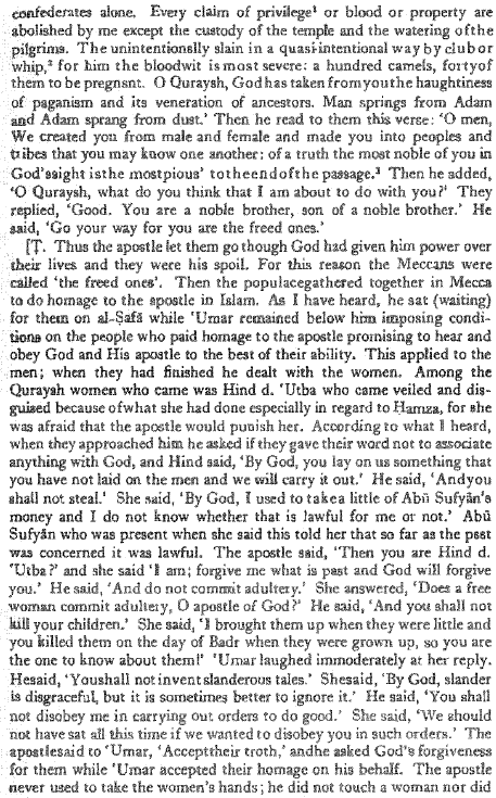 This passage comes from the main biography of the Prophet Muhammad, written in the 8th century by Ibn Ishaq and preserved in the history of Ibn Hisham in the 9th century. The woman described here, Hind bt. ‘Utba, is famous for her role in opposing the Prophet Muhammad. She went to the battles between Mecca and Medina to support the Meccans. Many members of her family were killed fighting the Prophet Muhammad. She took revenge by mutilating the corpses of fallen Muslims, famously eating the liver of the Prophet’s uncle Hamza. Her husband was Abu Sufyan, making her the ancestor of the Umayyads.