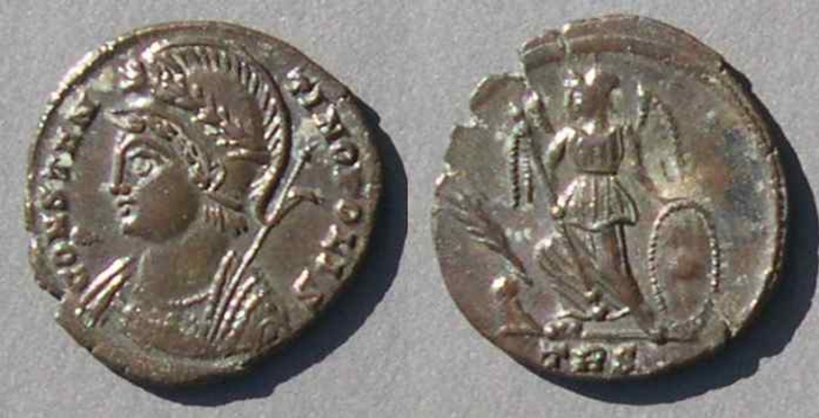 This coin, minted by Constantine, shows Constantine on one side and winged Victory on the other.