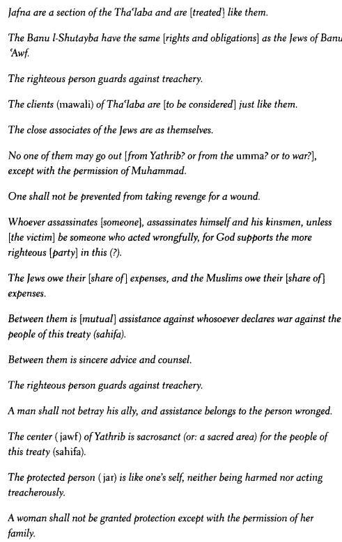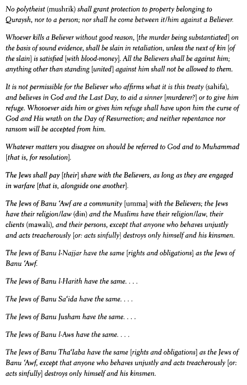 This document preserves some version of the agreement between the Prophet Muhammad and the people of Yathrib (the pre-Islamic name of the city Medina). It was preserved in a number of 9th-century texts, but many consider it to be authentic because it doesn’t fit neatly with the goals of 9th-century authors.
