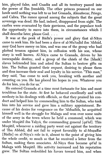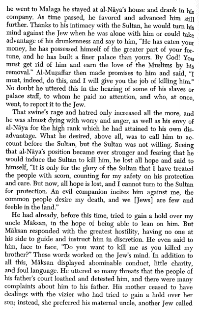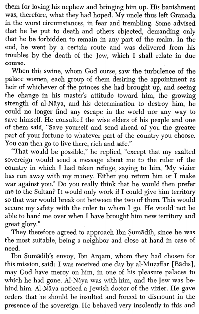 The following is an account of how things could go wrong. It is from Tibyan, written in Arabic by ‘Abd Allah bin Buluggin, the last Zirid emir of Granada. He describes the death of the Jewish vizier Yusuf b. Nagrella, who worked for the Berber Zirid dynasty in the middle of the 11th century.