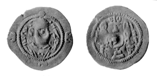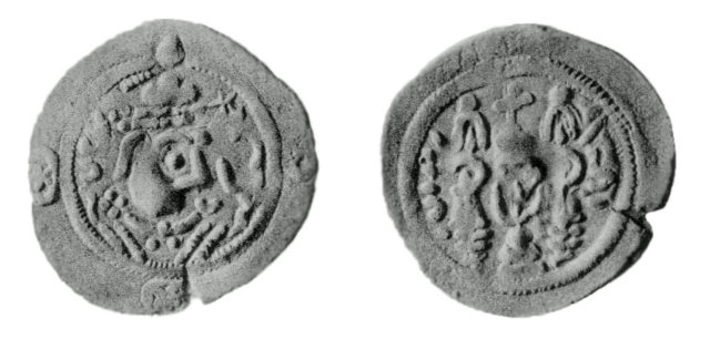 These coins were minted in the 7th century by Georgian princes, outside of the reach of Umayyad power. The coins show the Sasanian emperor Hormizd and include his name in Pahlavi script. But the fire altar has been replaced by a cross. There are several other issues of this type of coin, some with Georgian on them, too. You can read about them here.