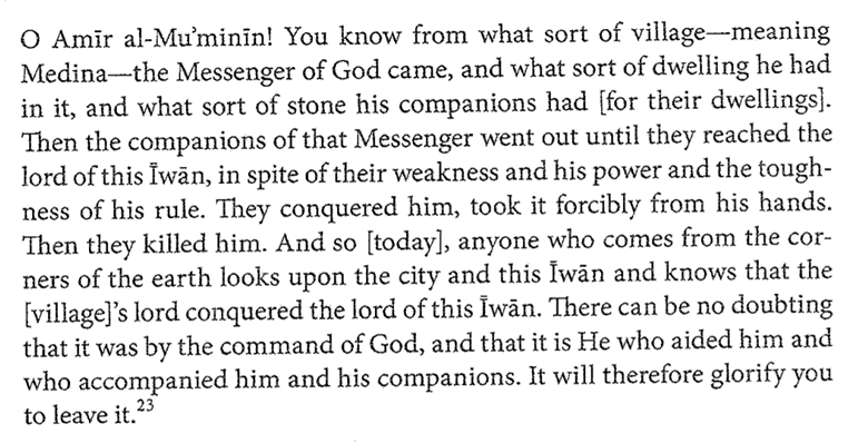 This passage comes from an 11th-century text by al-Khatib al-Baghdadi. He writes that a Persian secretary convinced the ‘Abbasid caliph Mansur to leave the ruins.