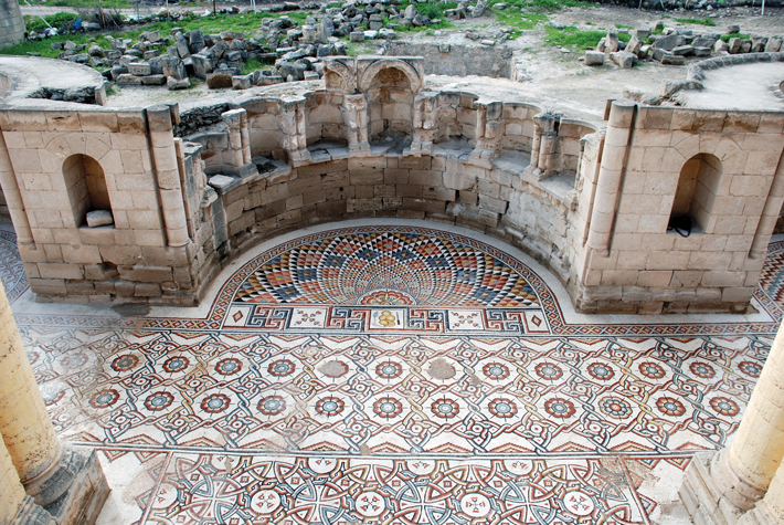 Khirbat al-Mafjar is an Umayyad palace now in the West Bank near Jericho. It was built in the 8th century by the caliph Hisham b. ‘Abd al-Malik. Many of the photos here come from this article if you’d like to read more; it argues that the Umayyads created a hybrid culture, merging Byzantine and Sasanian imagery.