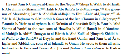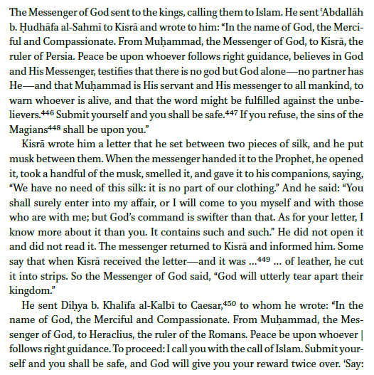 This passage relates the purported conversation between the Byzantine emperor Heraclius and Abu Sufyan, the leader of the Umayyads. It begins with the emperor summarizing their conversation about the Prophet Muhammad. This account comes from the book by ‘Abd al-Razzaq b. Hammam al-Himyari, who lived in the 9th century, but it preserves the reports of Ma’mar b. Rashid, who lived in the 8th.