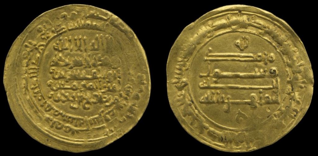 Obverse, in field: “There is no god except God alone, who has no associate. Abu Qasim the son of the Commander of the Faithful. Mardawij b. Ziyar”; inner margins: “this dinar was struck in Qumm in 322”; outer margins: Q3-:3-4. Reverse, in field: “for God, Muhammad is the messenger of God, al-Qahir b’illah”; in margins: Q9:33.