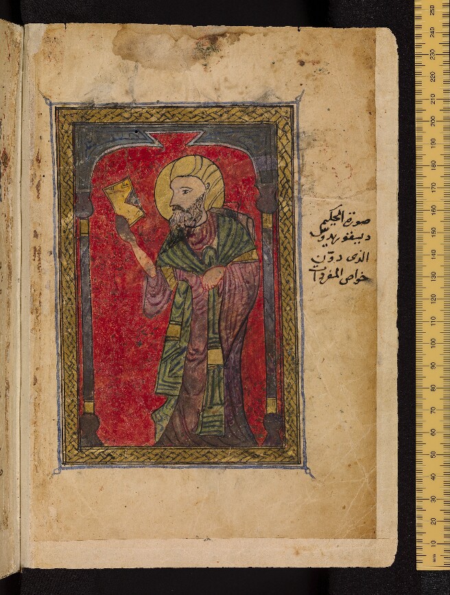 This image shows Dioscorides of Anazarbus, who wrote a medical treatise in the 1st century. His work was very popular and translated into many languages. This portrait was in an Arabic translation of his work, from 13th-century Baghdad.