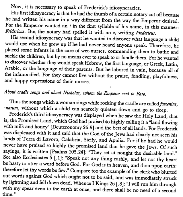 The Emperor was now disliked by all the people of Acre. He was the object of the Templars’ special disfavor. There was at that time a very brave Templar, Brother Peter de Montagu, a most valiant and noble man, as was also the master of the Teutonic Knights. The people of the lowlands39 also had little use for the Emperor. The Emperor seemed to be delaying. [conjectural reading of “de lais”] Every day, even in winter, be kept his galleys armed, with the oars in the locks. Many people said that he wished to seize the Lord of Beirut and his children, Sir Anceau de Bries and his other friends, the Master of the Temple and other persons and have them shipped to Apulia. Another said that he wished to have them killed at a council to which he had called and summoned them but that they had been aware of this and went to the council with such forces that he dared not do it.