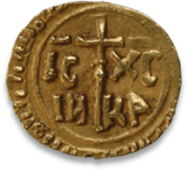 Left: a Latin cross, below the crosspiece on left the letters IC (Jesus) and on right XC (Christ); At base of shaft on left IN (sic) on right KA (i.e. NIKA – May he conquer); Margin: Kufic legend, mostly off flan, giving mint and date.