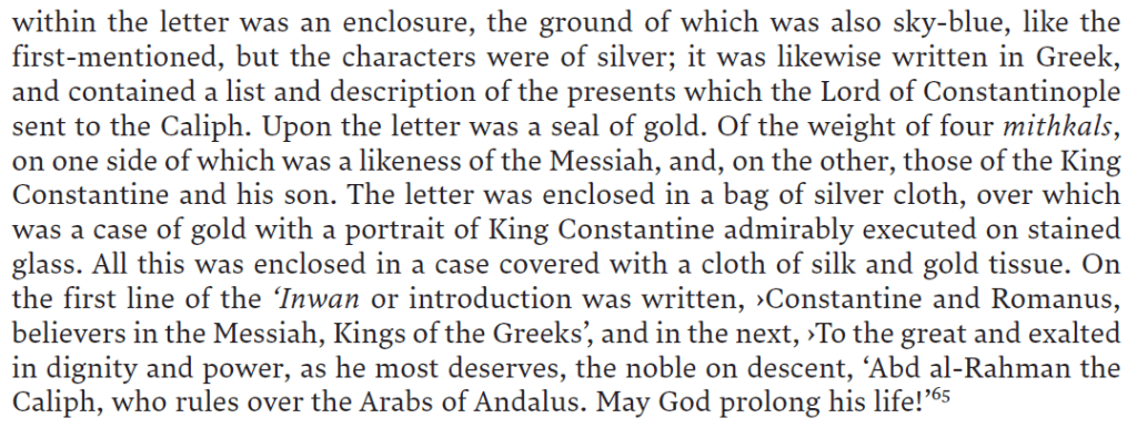 This snippet is from Maqqari’s description of the reign of ‘Abd al-Rahman III. Maqqari was a North African historian who wrote his history of Andalus in Arabic; it is one of the most important sources on Andalusi history. Here, he describes a letter from the Byzantine emperor Constantine VII to the Umayyad caliph ‘Abd al-Rahman.