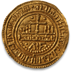 Right: Center: Prince of the Catholics, Alfonso son of Sancho, May God protect and assist him!; Margin: this dinar was struck in the City of Toledo the year three and twenty and two hundred and one thousand safar (era) [1185].