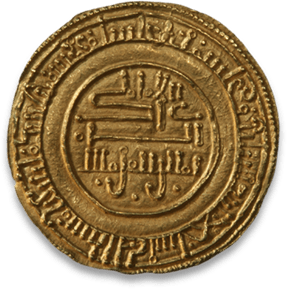 Right: Center: the Prince, Servant of God, Commander of the Faithful; Margin: in the name of God this dinar was struck in Aghmat the year three and ninety and four hundred.