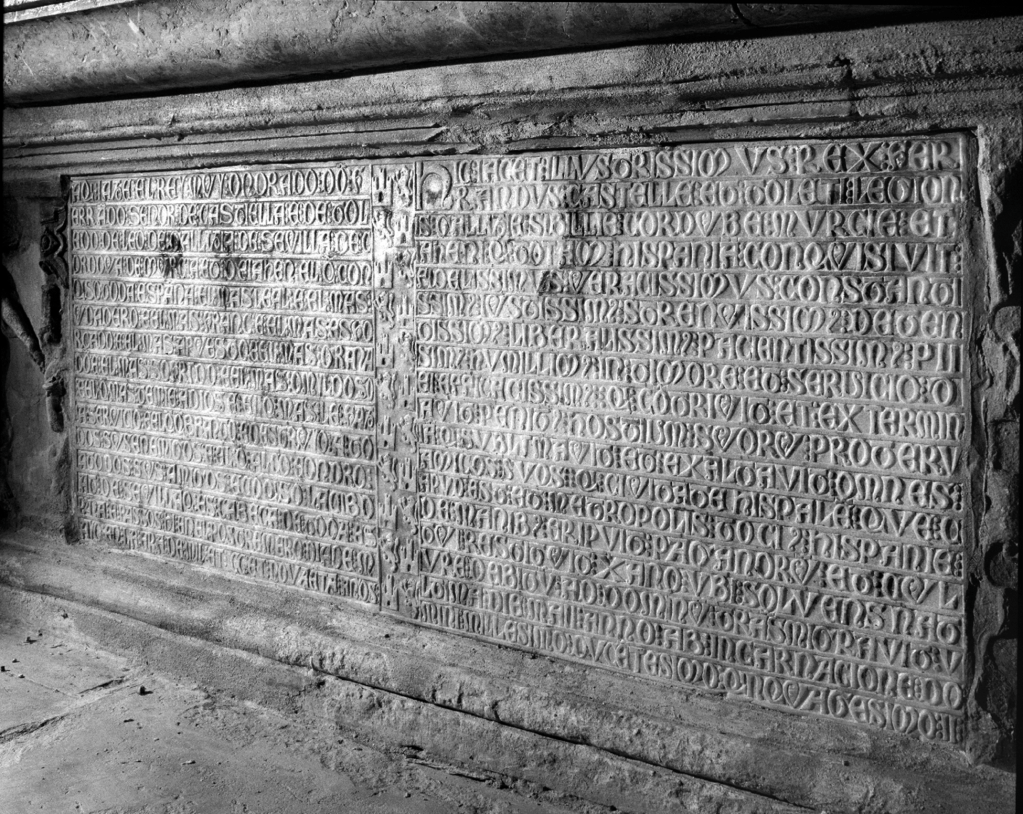 Here lies the most honored king Don Ferdinand, lord of Castile and Toledo, of León, of Galicia, of Seville, of Cordoba, of Murcia, and of Jaén, he who conquered all of Spain (toda España), the most loyal and most truthful and the most forthright, the strongest and most decorated, the most illustrious and the most forbearing and the most humble and thos one who is most fearful of God, and the one who did the most service to Him; who broke and destroyed all of his enemies, who praised and honored all of his friends, and conquered the city of Seville which is the capital of all of Spain and died in it on the last day of May in our era, the year of 1290.