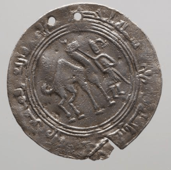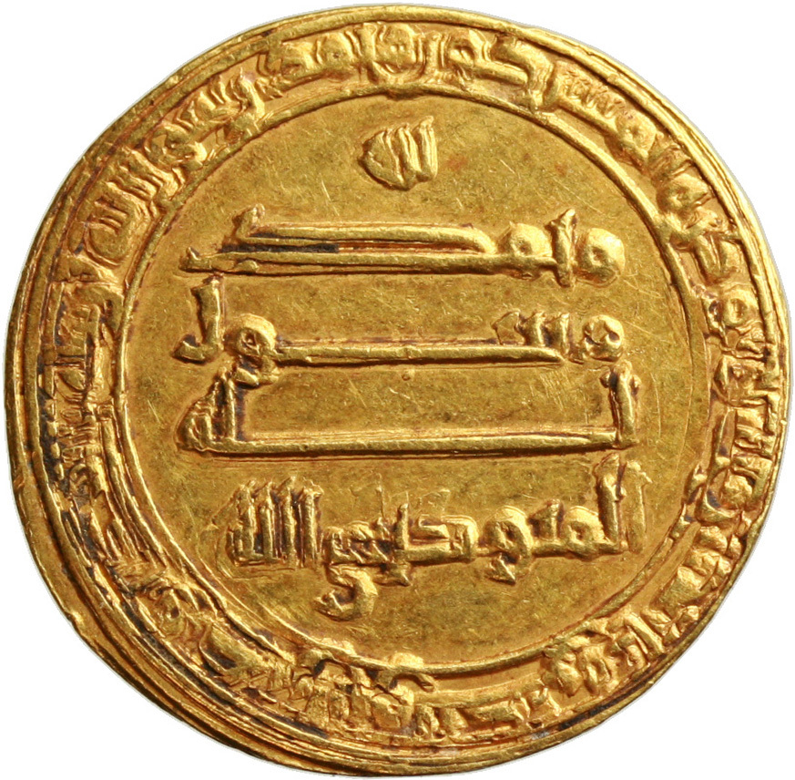 This medallion is very unusual. It shows Mutawakkil on one side and a camel on the other. Scholars have wondered if it represents the caliph’s defeat of the Buja, a camel-riding people in the Sudan. The inscription reads: “In the name of God, Muhammad is his messenger, al-Mutawakkil bi-Allah”, and on the reverse: “In the year [AH] 241 [AD 855/6] al-Mu`tazz bi-Allah”.