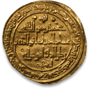 Obverse, in field: (in Arabic) “there is no god except God alone, who has no associate. Muhammad is the messenger of God. al-Muti’ li’llah. Rukn al-Dawla Abu ‘Ali Buyeh”; on margins: “In the name of God, this dinar was made in Muhammadiyya [= Rayy] in the year 351 … [possibly: in the year of the hijra of the Prophet], peace be upon him.”