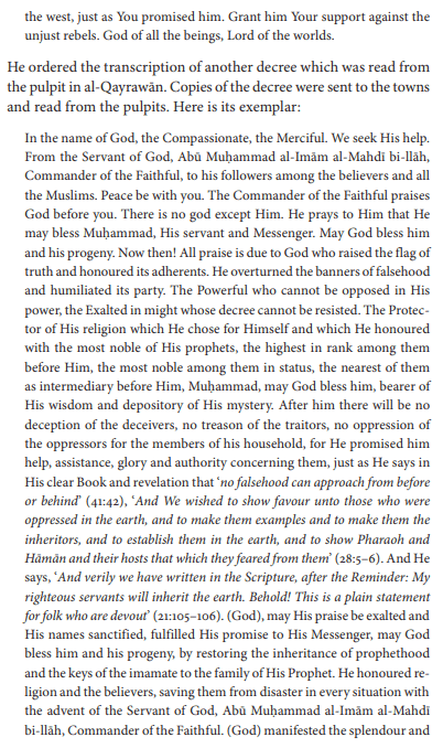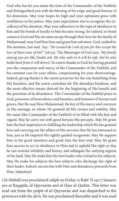 These two letters were read off during prayers in the main cities of Ifriqiyya. They were recorded in the history of Qadi l-Nu’man, one of the main da’is of the Fatimid state.