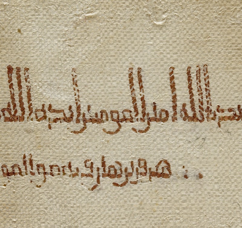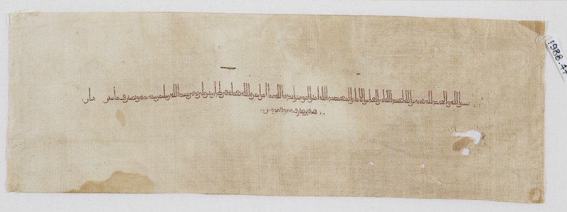 This one has the inscription in red silk, naming Abbasid caliph al-Mu’tadid bi’llah (ruled 892-901) and the Tulunid ruler of Egypt Harun ibn Khumarawayh (ruled 896-904). It was made in Tinnis in 900-1.
